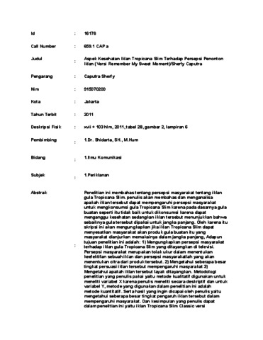 Sherfy, Caputra (2011) Aspek Kesehatan Iklan Tropicana Slim Terhadap Persepsi Penonton Iklan (Versi Remember My Sweet Moment)/Sherfy Caputra. Skripsi thesis, UNIVERSITAS TARUMANAGARA.