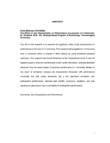 Mellinda, Syifa (2014) Pengaruh Karakteristik Pekerjaan Terhadap Kinerja Pada Dosen Universitas X. Skripsi thesis, Universitas Tarumanagara.