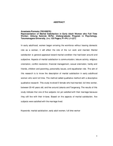 Permata, Anastasia (2014) Gambaran Kepuasan Perkawinan Pada Perempuan Dewasa Awal Yang Bekerja Full Time. Skripsi thesis, Universitas Tarumanagara.