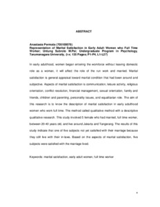 In early adulthood, women began entering the workforce without leaving domestic role as a woman, it will affect the role of the run work and married. Marital satisfaction is general appraisal toward marital condition that had been around and subjective. Aspects of marital satisfaction is communication, leisure activity, religious orientation, conflict resolution, financial management, sexual orientation, family and friends, children and parenting, personality issues, and equalitarian role. The aim of this research is to know the description of marital satisfaction in early adulthood women who work full time. The method called qualitative method with a descriptive qualitative research. This study involved 5 female who had married, full time worker, between 20-40 years old, and live around Jakarta and Tangerang. The results of this study indicate that one of five subjects not yet satisfied with their marriage because they still live with their in-laws. Based on the aspects of marital satisfaction, five subjects were satisfied with the marriage lived.