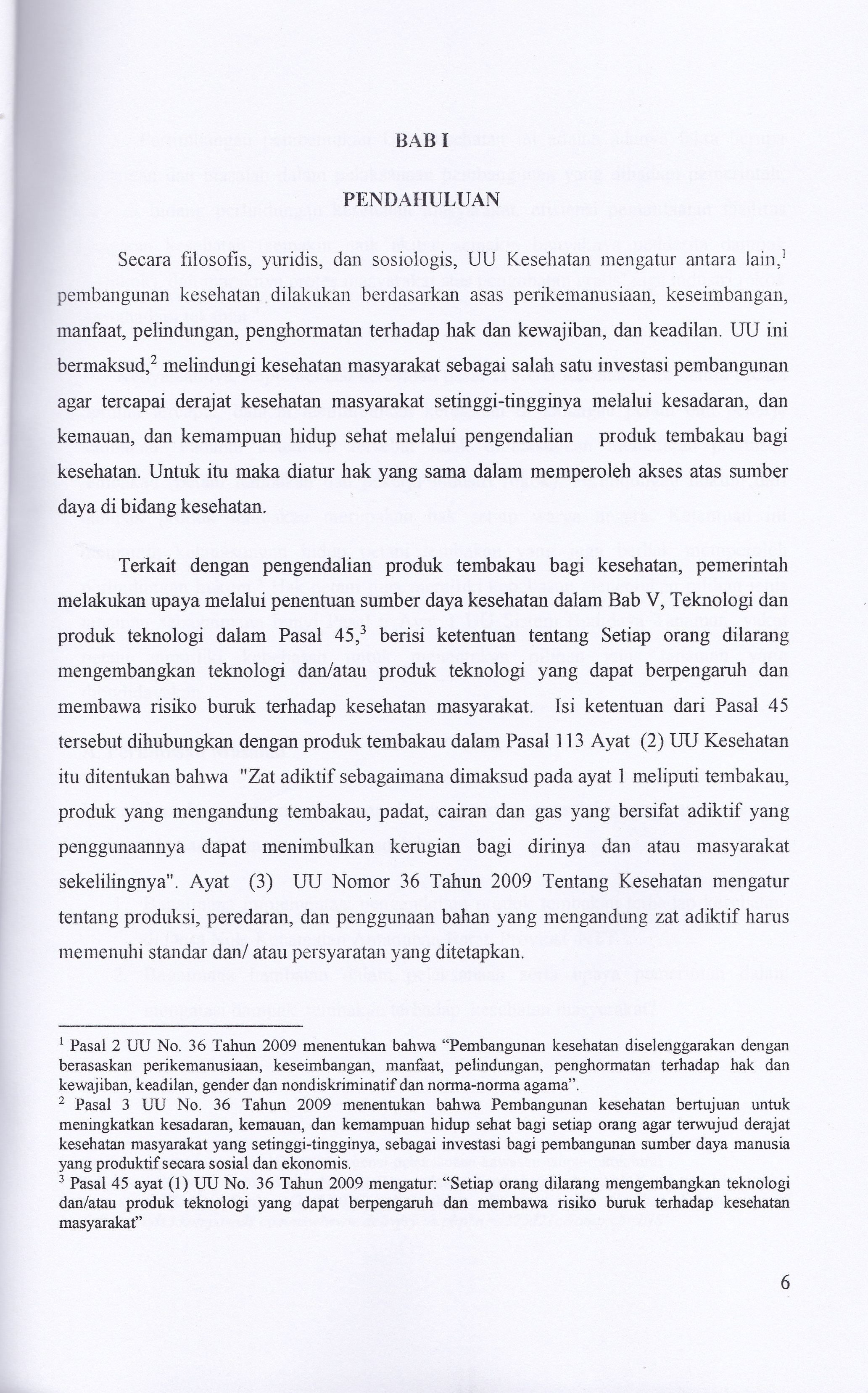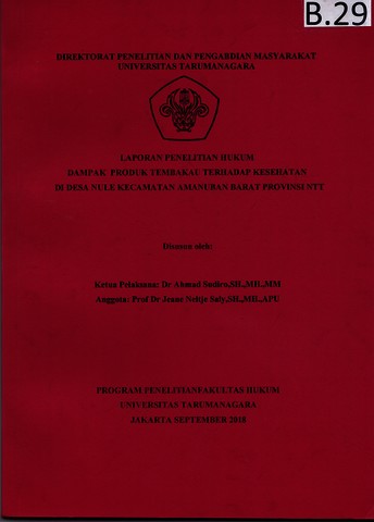 Dalam kaitan dengan perwujudan tujuan pembangunan untuk mencapai kesejahteraan, maka hukum dijadikan patokan utama, dalam melindungi kebutuhan hak asasi masyarakat, dalam menunjang berhasilnya pembangunan. Pelaksanaan tertib kehidupan bermasyarakat dalam lingkungan hidup yang baik dan sehat serta memperoleh pelayanan kesehatan memlalui kewajiban penghotmatan hak asasi manusia dilakukan pemerintah melalui pengaturan hak dan kewajiban, antara lain dalam memproduksi segala bahan yang dipergunakan agar tercipta kesehatan, baik dikonsumsi masyarakat, maupun pengaruhnya juga terhadap orang lain. Permasalahannya adalah bagaimana dampak produk tembakau terhadap kesehatan di Desa Nule Kabupaten Amanuban Barat Provinsi NTT; dan Bagaimana hambatan dalam pelaksanaan serta upaya pemerintah dalam mengatasi dampak tersebut Laporan penelitian ini membahas dampak tembakau terhadap kesehatan, hambatan dan upaya pemerintah dalam mengatasinya.