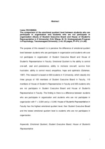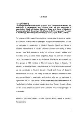 The purpose of this research is to perceive the difference of emotional quotient level between students who are participate in organization and students who are not participate in organization of Student Executive Board and House of Student's Representative in Faculty. Emotional Quotient is the ability to control one-self, zeal and persistence, ability to motivate one-self, survive from frustration, ability to control mood, empathize, hope and optimistic (Goleman, 1997). This research is based on 666 students in X University, which classify into three groups of 183 members of Student Executive Board in Faculty, 118 members of House of Student's Representative in Faculty and 365 students who are not participate in Student Executive Board and House of Student's Representative in Faculty. The finding is there is a difference between students who are participate in organization and students who are not participate in organization with F = 3,504 and p = 0,048. House of Student’s Representative in Faculty has the highest emotional quotient level, then Student Executive Board and the lowest emotional quotient level is students who are not participate in organization.