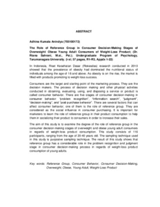 Anindya, Adhina Kumala (2014) Gambaran Peran Kelompok Acuan Dalam Tahapan Proses Pengambilan Keputusan Konsumen Produk Penurunan Berat Badan Pada Individu Dewasa Muda Kelebihan Berat Badan / Obesitas. Skripsi thesis, Universitas Tarumanagara.