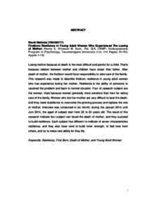 Losing mother because of death is the most difficult and painful for a child. That’s because relation between mother and children have closer than father. After death of mother, the firstborn would have responsibility to take care of the family. This research was made to describe firstborn resilience in young adult woman who has experience losing her mother. Resilience is the ability of someone to resolved the problem and back to normal situation. Four of research subject are the woman, thats because woman generally more sensitive than men for taking care of the family. Woman who lost her mother are very difficult to face the death, and they need reseilience to overcome the grieving process and replace the role of mother. Interview was conducted in six month, during the Januari 2014 until Juni 2014, the aged of subject start from 22 to 24 years old. The result of this research indicate four subject can faced the death of mother, and they succeed to build resilience. Each subject has different to indicate of seven characteristics resilience, and they also have tend to build inner strength, to feel love from others, and try to make new ability for they life.