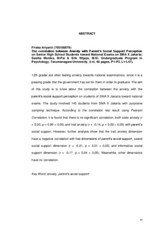 Ariyanti, Friska (2014) Hubungan Antara Kecemasan Dengan Persepsi Dukungan Sosial Orangtua Pada Siswa SMA Menjelang Ujian Nasional. Skripsi thesis, Universitas Tarumanagara.