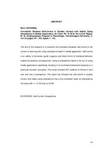 The aim of this research is to examine the correlation between self-control in the context of learning with using smartphone habit in mobile application. Self-control is an ability to formulate, guide, organize and direct forms of individual behavior toward the positive consequences. Using a smartphone habits is the act of using media applications repetitively resulting in an automatic behavioral response to a particular situation and goals. This study included 257 students of School X who own and use a smartphone. The result has showed that self-control in studies context and habits using smartphone has a low correlation level, as indicated by the value with r= -0,123 and p= 0,049.