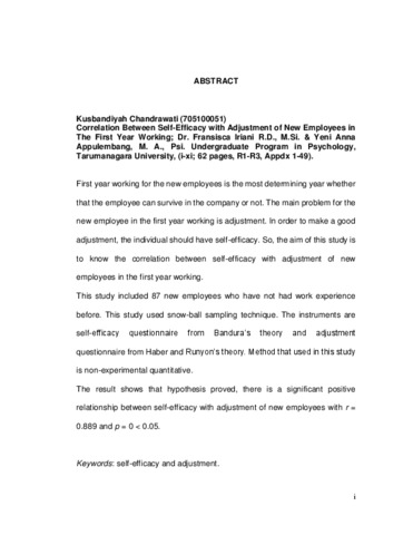 This study included 87 new employees who have not had work experience before. This study used snow-ball sampling technique. The instruments are self-efficacy questionnaire from Bandura’s theory and adjustment questionnaire from Haber and Runyon’s theory. Method that used in this study is non-experimental quantitative.