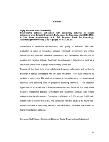 Putri, Ingky Yulianda (2014) Hubungan antara self esteem dengan perilaku konformitas pada remaja putri yang melakukan perawatan wajah. Skripsi thesis, Universitas Tarumanagara.