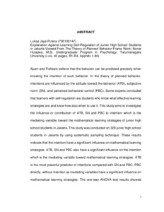 Ajzen and Fishbein believe that the behavior can be predicted precisely when knowing the intention of such behavior. In the theory of planned behavior, intentions are influenced by the attitude toward the behavior (ATB), subjective norm (SN), and perceived behavioral control (PBC). Some experts concluded that learners with self-regulation are students who know what effective learning strategies are and know how also when to use it. This study aims to investigate the influence or contribution of ATB, SN and PBC to intention which is the mediating variable toward the mathematical learning strategies of junior high school students in Jakarta. This study was conducted on 328 junior high school students in Jakarta by using systematic sampling technique. These results indicate that the intention have a significant influence on mathematical learning strategies. ATB, SN and PBC also have a significant influence on the intention which is the mediating variable toward mathematical learning strategies. ATB is the most powerful predictor of intentions compared with SN and PBC. PBC directly, without intention as mediating variables have a significant influence on mathematical learning strategies. The one-way ANOVA test results showed that there are significant differences between grade 9 to grade 7 and 8 in the level of mathematical learning strategies.