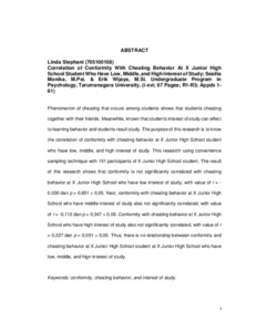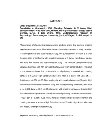 Stephani, Linda (2014) Hubungan Konformitas Dengan Perilaku Mencontek Pada Siswa SMP X yang Memiliki Minat Belajar Rendah, Sedang, dan Tinggi. Skripsi thesis, Universitas Tarumanagara.