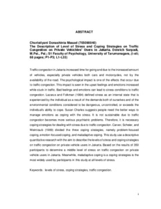 Donashinta, Choristiyani (2014) Gambaran tingkat stress pada strategi coping terhadap kemacetan lalu lintas pada pengguna kendaraan pribadi di Jakarta. Skripsi thesis, Universitas Tarumanagara.