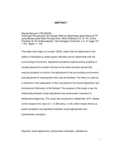 Bansumi, Mareta (2014) Hubungan penyesuaian diri dengan motivasi berprestasi pada siswa SLTP. Skripsi thesis, Universitas Tarumanagara.