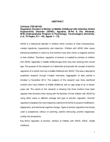 Celvina, Celvina (2014) Gambaran regulasi emosi pada ibu yang memiliki anak middle childhood dengan attention deficit hyperactivity disorder (ADHD). Skripsi thesis, Universitas Tarumanagara.