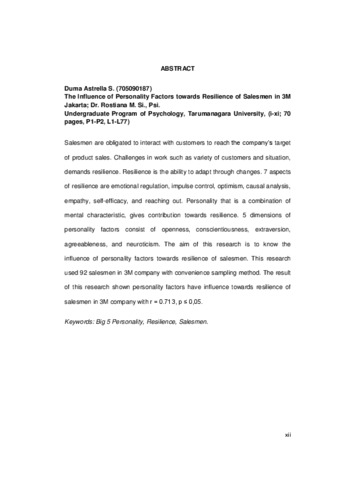 Salesmen are obligated to interact with customers to reach the company’s target of product sales. Challenges in work such as variety of customers and situation, demands resilience. Resilience is the ability to adapt through changes. 7 aspects of resilience are emotional regulation, impulse control, optimism, causal analysis, empathy, self-efficacy, and reaching out. Personality that is a combination of mental characteristic, gives contribution towards resilience. 5 dimensions of personality factors consist of openness, conscientiousness, extraversion, agreeableness, and neuroticism. The aim of this research is to know the influence of personality factors towards resilience of salesmen. This research used 92 salesmen in 3M company with convenience sampling method. The result of this research shown personality factors have influence towards resilience of salesmen in 3M company with r = 0.713, p ≤ 0,05.