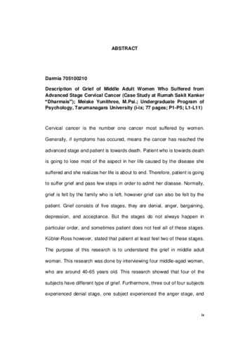 Cervical cancer is the number one cancer most suffered by women. Generally, if symptoms has occured, means the cancer has reached the advanced stage and patient is towards death. Patient who is towards death is going to lose most of the aspect in her life caused by the disease she suffered and she realizes her life is about to end. Therefore, patient is going to suffer grief and pass few steps in order to admit her disease. Normally, grief is felt by the family who is left, however grief can also be felt by the patient. Grief consists of five stages, they are denial, anger, bargaining, depression, and acceptance. But the stages do not always happen in particular order, and sometimes patient does not feel all of these stages. Kübler-Ross however, stated that patient at least feel two of these stages. The purpose of this research is to understand the grief in middle adult woman. This research was done by interviewing four middle-aged women, who are around 40-65 years old. This research showed that four of the subjects have different type of grief. Furthermore, three out of four subjects experienced denial stage, one subject experienced the anger stage, and two subjects experienced depression. Finally, all four subjects experienced the acceptance stage.