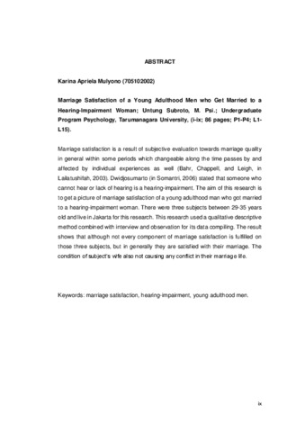 Marriage satisfaction is a result of subjective evaluation towards marriage quality in general within some periods which changeable along the time passes by and affected by individual experiences as well (Bahr, Chappell, and Leigh, in Lailatushifah, 2003). Dwidjosumarto (in Somantri, 2006) stated that someone who cannot hear or lack of hearing is a hearing-impairment. The aim of this research is to get a picture of marriage satisfaction of a young adulthood man who got married to a hearing-impairment woman. There were three subjects between 29-35 years old and live in Jakarta for this research. This research used a qualitative descriptive method combined with interview and observation for its data compiling. The result shows that although not every component of marriage satisfaction is fulfilled on those three subjects, but in generally they are satisfied with their marriage. The condition of subject’s wife also not causing any conflict in their marriage life.