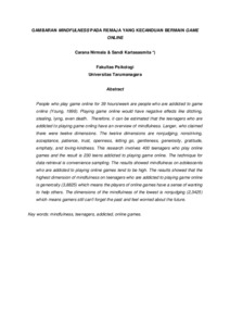 People who play game online for 39 hours/week are people who are addicted to game online (Young, 1998). Playing game online would have negative effects like ditching, stealing, lying, even death. Therefore, it can be estimated that the teenagers who are addicted to playing game onling have an overview of mindfulness. Langer, who claimed there were twelve dimensions. The twelve dimensions are nonjudging, nonstriving, acceptance, patience, trust, openness, letting go, gentleness, generosity, gratitude, emphaty, and loving-kindness. This research involves 400 teenagers who play online games and the result is 230 teens addicted to playing game online. The technique for data retrieval is convenience sampling. The results showed mindfulness on adolescents who are addicted to playing online games tend to be high. The results showed that the highest dimension of mindfulness on teenagers who are addicted to playing game online is generosity (3,8825) which means the players of online games have a sense of wanting to help others. The dimensions of the mindfulness of the lowest is nonjudging (2,3425) which means gamers still can't forget the past and feel worried about the future.