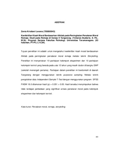 Kristiani Levana, Zenia (2012) Keefektifan Kisah Moral Berdasarlan Alkitab pada Peningkatan Penalaran Moral Remaja (Studi pada Remaja di Gereja X Tangerang). Skripsi thesis, universitas Tarumanagara.