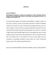A normal born person getting into an accident resulting disability is a tragedy to accept. This study aims to provide an overview of psychological well-being on people with disabilities resulted from an accident. The author concluded that psychological well-being is how one views or judges his or herself, and how one realizes the potentials existing within him or her to achieve self-determination and socialize with other people or the environment. The method “in-depth interview” was conducted toward two men in early adulthood who were in the age ranging from twenty to forty years old. This study lasted for ten months, starting from February 2012 until November 2012. It was indicated in the study that both subjects have the characteristic of psychological well-being in positive relation with others, environmental mastery, purpose in life, and personal growth dimensions.