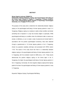 Ogesta Lembong, Moses (2013) Hubungan antara Religious Coping dengan Psychological Well being pada Mantan Penderita Kusta (Studi di Daerah X, Tangerang). Skripsi thesis, universitas Tarumanagara.
