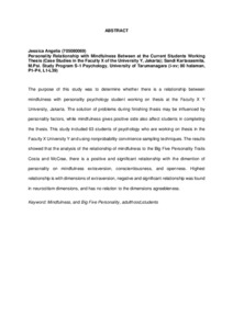 The purpose of this study was to determine whether there is a relationship between mindfulness with personality psychology student working on thesis at the Faculty X Y University, Jakarta. The solution of problems during finishing thesis may be influenced by personality factors, while mindfulness gives positive side also affect students in completing the thesis. This study included 63 students of psychology who are working on thesis in the Faculty X University Y and using nonprobability convinience sampling techniques. The results showed that the analysis of the relationship of mindfulness to the Big Five Personality Traits Costa and McCrae, there is a positive and significant relationship with the dimention of personality on mindfulness extraversion, conscientiousness, and openness. Highest relationship is with dimensions of extraversion, negative and significant relationship was found in neurocitism dimensions, and has no relation to the dimensions agreebleness.