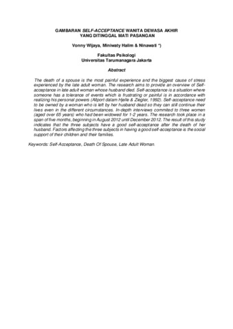 The death of a spouse is the most painful experience and the biggest cause of stress experienced by the late adult woman. The research aims to provide an overview of Self-acceptance in late adult woman whose husband died. Self-acceptance is a situation where someone has a tolerance of events which is frustrating or painful is in accordance with realizing his personal powers (Allport dalam Hjelle & Ziegler, 1992). Self-acceptance need to be owned by a woman who is left by her husband dead so they can still continue their lives even in the different circumstances. In-depth interviews commited to three women (aged over 65 years) who had been widowed for 1-2 years. The research took place in a span of five months, beginning in August 2012 until December 2012. The result of this study indicates that the three subjects have a good self-acceptance after the death of her husband. Factors affecting the three subjects in having a good self-acceptance is the social support of their children and their families.