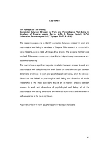 Ramadhani, Vivi (2013) Hubungan antara Stressor Kerja dengan Psychological Well Being pada Anggota Gegana. Skripsi thesis, universitas Tarumanagara.
