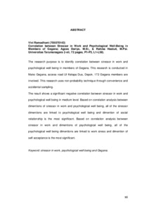 "The research purpose is to identify correlation between stressor in work and psychological well being in members of Gegana. This research is conducted in Mako Gegana, access road UI Kelapa Dua, Depok. 172 Gegana members are involved. This research uses non-probability technique through convenience and accidental sampling.