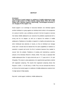 Social support is an exchange of resources between one individual against another individual or a group against an individual which refers to the acceptance of a sense of comfort, care, confidence, and aid in the form of goods or services that makes middle adolescents can overcome the problems experienced with a strong and do not despair, as well as to improve the welfare of middle adolescents. Resilience is the ability to respond in a healthy and productive way, when individuals face adversity or trauma, so that an individual can manage stress well. It should also be realized that the same capabilities of resilience is essential to expand and enrich the life of someone because they needed to recover from the setback. Resilience of creating and maintaining a positive attitude of the individual (Reivich & Shatte, 2002). The study is assessed 362 middle adolescents from X’s high school who are 14 -17 years old in X, XI, adn XII grades. This study is using explanatory non experimental quantitative method with regression analyzing. The results from regression analyzing shows that Rsquare = 0,235, t = 18, 202, dan p = 0,000. Thus, we can conclude that there is an influnce from social support on resilience of middle adolescence students from X’s high school in West Jakarta.