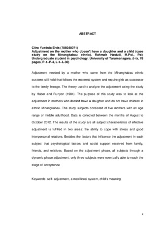 Adjustment needed by a mother who came from the Minangkabau ethnic customs still hold that follows the maternal system and require girls as successor to the family lineage. The theory used to analyze the adjustment using the study by Haber and Runyon (1984). The purpose of this study was to look at the adjustment in mothers who doesn’t have a daughter and do not have children in ethnic Minangkabau. The study subjects consisted of five mothers with an age range of middle adulthood. Data is collected between the months of August to October 2012. The results of the study are all subject characteristics of effective adjustment is fulfilled in two areas: the ability to cope with stress and good interpersonal relations. Besides the factors that influence the adjustment in each subject that psychological factors and social support received from family, friends, and relatives. Based on the adjustment phase, all subjects through a dynamic phase adjustment, only three subjects were eventually able to reach the stage of acceptance.