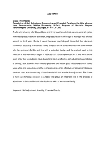 Grace, Grace (2012) Gambaran Proses Penyesuaian Diri terhadap Keluarga Besar pada Istri yang belum memiliki Keturunan. Skripsi thesis, universitas Tarumanagara.