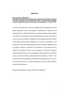 The aim of this research is to find out the differences of self-disclosure from self identity observation muslim early adulthood. Self-disclosure is related to act of expressing which is verbal characteristic to the others belonging to thinking, feeling and experience. Self identity means as self development situation which have or not the crisis and commitment. Individual who have already achieve their identity will be happy and have high self-disclosure. The amount of participants in this research are 158 Muslim early adulthood have four self identity categories, there are diffusion, forelosure, moratorium and achievement. The researcher did this research by quantitative method, use the quesioner for collecting the data and used Kruskal-Wallis test as a result of preparation data. Indication of this research result is not found the difference self-disclosure from self identity, P=0,607 > 0,05. The result shows that participants of self identity have already achieve, then it can not said that is high or low to execute self-disclosure, also the diffusion identity, forelosure and moratorium.