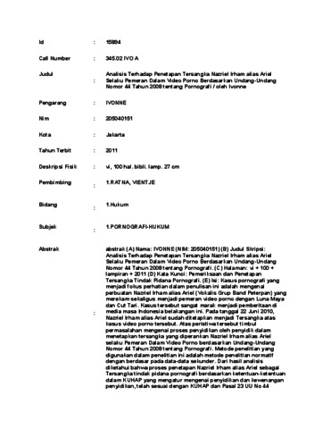 IVONNE, IVONNE (2011) Analisis Terhadap Penetapan Tersangka Nazriel Irham alias Ariel Selaku Pemeran Dalam Video Porno Berdasarkan Undang-Undang Nomor 44 Tahun 2008 tentang Pornografi / oleh Ivonne. Skripsi thesis, UNIVERSITAS TARUMANAGARA.