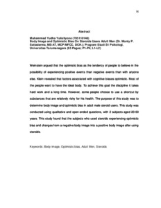 Weinstein argued that the optimistic bias as the tendency of people to believe in the possibility of experiencing positive events than negative events than with anyone else. Klein revealed that factors associated with cognitive biases optimistic. Most of the people want to have the ideal body. To achieve this goal the discipline it takes hard work and a long time. However, some people choose to use a shortcut by substances that are relatively risky for his health. The purpose of this study was to determine body image and optimistic bias in adult male steroid users. This study was conducted using qualitative and open-ended questions, with 2 subjects aged 20-60 years. This study found that the subjects who used steroids experiencing optimistic bias and changes from a negative body image into a positive body image after using steroids.