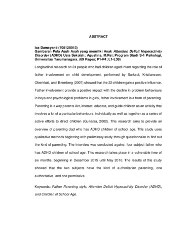 Damayanti, Ica (2016) Gamabran pola asuh ayah yang memiliki anak attention deficit hyperactivity disorder (ADHD) usia sekolah. Skripsi thesis, Universitas Tarumanagara.