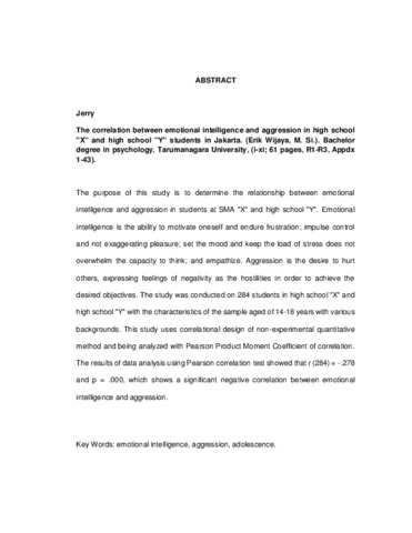 Jerry, Jerry (2016) Hubungan antara kecerdasan emosi dengan agresi paa siswa SMA “X” dan SMA “Y” di Jakarta. Skripsi thesis, Universitas Tarumanagara.