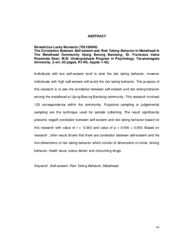 Novianto, Benedictus Lucky (2016) Hubungan antara self-esteem dengan risk taking behavior pada penggemar musik metal di komunitas metal Ujung Berung Bandung. Skripsi thesis, Universitas Tarumanagara.