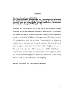 Individuals with low self-esteem tend to take the risk taking behavior, nowever individuals with high self-esteem will avoid the risk taking behavior. The purpose of this research is to see the correlation between self-esteem and risk taking behavior among the metalhead at Ujung Berung Bandung community. This research involved 125 correspondence within the community. Purposive sampling or judgemental sampling are the technique used for sample collecting. The result significantly presents negatif correlation between self-esteem and risk taking behavior based on this research with value of r = -0.362 and value of p = 0.000 < 0.005. Based on research , other result shows that there are correlation between self-esteem and the five dimensions of risk taking behavior which consist of dimensions of crime, driving behavior, health issue, status denial, and consuming drugs.