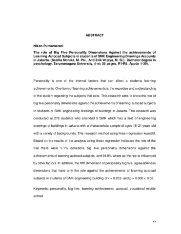 Purnamarani, Niken (2016) Peranan dimensi kepribadian five terhadap prestasi belajar mata pelajaran Autocad pada siswa SMK Jurusan Teknik Gambar Bangunan di Jakarta. Skripsi thesis, Universitas Tarumanagara.