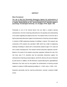 Personality is one of the internal factors that can affect a students learning achievements. One form of learning achievements is the expertise and understanding of the student regarding the subjects that exist. This research aims to know the role of big five personality dimensions against the achievements of learning autocad subjects in students of SMK engineering drawings of buildings in Jakarta. This research was conducted at 276 students who attended 5 SMK which has a field of engineering drawings of buildings in Jakarta with a characteristic sample of ages 16-21 years old with a variety of backgrounds. This research method using linear regression kuantitif. Based on the results of the analysis using linear regression indicates the role of the trial there were 5.1% donations big five personality dimensions against the achievements of learning autocad subjects, and 94.9% where as the rest is influenced by other factors. In addition, the fifth dimension of personality big five, agreeableness dimensions that have only the role against the achievements of learning autocad subjects in students of SMK engineering building of r = 0.202- and p = 0.000 < 0.05.