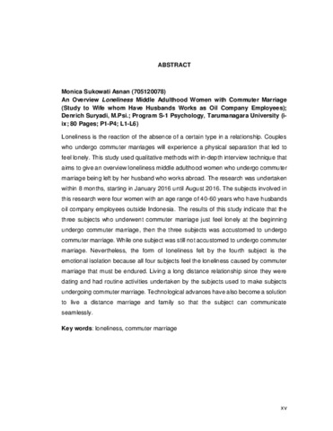 Asnan, Monica Sukowati (2016) Gambaran loneliness wanita dewasa menengah yang menjalani pernikahan jarak jauh (Studi pada istri karyawan perusahaan minyak). Skripsi thesis, Universitas Tarumanagara.