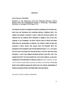 The research was done to investigate the resilience of adolescence in their latter year, whom have quit themselves from committing self-injury. Resilience itself is the capacity and strength of someone in order to deal with self-injury problem. Any individual who has resilience within themselves is capable to rise up from their sufferings. In this investigation, the author used the theory of Reivich and Shatté (2002) about the characteristics of resilience. The method to collect the data was conducted in eleven months, from January 2016 until November 2016. The participants of this investigation were three late adolescence girls, J, A, L. J is 21 years old, and A and L are 22 years old. They did self-injury in one form, which was cutting themselves. J and A have stopped committing self-injury since 2015, and L has stopped since 2013. The result revealed that J and A have resilience, as they were complied all of the characteristics of resilience, consist of emotion regulation, impulse control, optimism, causal analysis, empathy, self-efficacy, and reaching out. For L, she tends to have resilience because she doesn’t have one of seven characteristics of resilience according to Reivich and Shatté (2002), that’s self-efficacy.