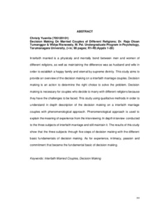 B, Christy Yuanita (2016) Gambaran pengambilan keputusan pada pasangan yang menikah beda agama. Skripsi thesis, Universitas Tarumanagara.