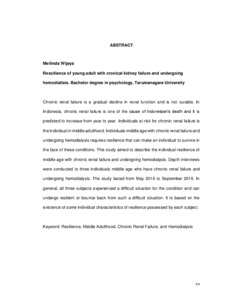 Wijaya, Meilinda (2016) Resiliensi individu dewasa madya dengan gagal ginjal kronis dan sedang menjalani hemodialisis. Skripsi thesis, Universitas Tarumanagara.