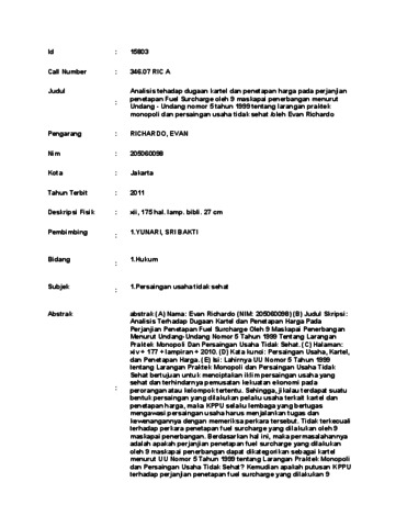 EVAN, RICHARDO (2011) Analisis tehadap dugaan kartel dan penetapan harga pada perjanjian penetapan Fuel Surcharge oleh 9 maskapai penerbangan menurut Undang - Undang nomor 5 tahun 1999 tentang larangan praktek monopoli dan persaingan usaha tidak sehat /oleh Evan Richardo. Skripsi thesis, UNIVERSITAS TARUMANAGARA.