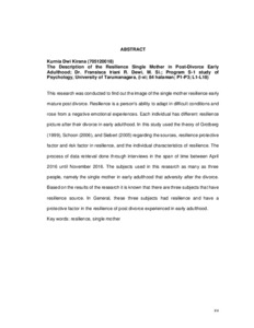This research was conducted to find out the image of the single mother resilience early mature post divorce. Resilience is a person's ability to adapt in difficult conditions and rose from a negative emotional experiences. Each individual has different resilience picture after their divorce in early adulthood. In this study used the theory of Grotberg (1999), Schoon (2006), and Siebert (2005) regarding the sources, resilience protective factor and risk factor in resilience, and the individual characteristics of resilience. The process of data retrieval done through interviews in the span of time between April 2016 until November 2016. The subjects used in this research as many as three people, namely the single mother in early adulthood that adversity after the divorce. Based on the results of the research it is known that there are three subjects that have resilience source. In General, these three subjects had resilience and have a protective factor in the resilience of post divorce experienced in early adulthood.
