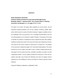 The death of the father will greatly affect especially the young women, she will experience emotional problems such as loss, sadness, loneliness. Sudden death events will be worse for a person left behind, because it happens suddenly and can be a challenge in life for young women. Thus, a teenager should be able to rise from the existing problem so as to become a resilient individual. The purpose of this study to describe the resilience of adolescence whose experienced father died suddenly. Qualitative methods were used in this study and the data were collected by interview. This study took four months, started on February 2017 until May 2017. The subjects of this study were 4 adolescence aged 18-21 whose father died suddenly. The results showed that the four subjects were able to reach a resilient individual because they had support from the social environment, self-belief, and ability to be able to act after a depressed condition. The four subjects reached the thriving level, in which the four subjects were able to get through their difficulties and make the negative emotion experience as a life challenge as well as the benefit for himself to become a better individual.