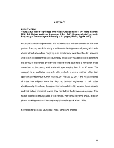 Dewi, Puspita (2017) Gambaran forgiveness pria dewasa muda yang ayahnya pernah berselingkuh. Skripsi thesis, Universitas Tarumanagara.