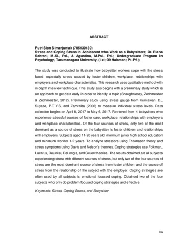 Simanjuntak, Putri Sion (2017) Gambaran stress dan coping stress pada remaja perempuan yang bekerja sebagai babysitter. Skripsi thesis, Universitas Tarumanagara.