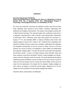 The study was conducted to illustrate how babysitter workers cope with the stress faced, especially stress caused by foster children, workplace, relationships with employers and workplace characteristics. This research uses qualitative method with in depth interview technique. This study also begins with a preliminary study which is an approach to get data early in order to identify a topic (Shaughnessy, Zechmesiter & Zechmeister, 2012). Preliminary study using stress gauge from Kurniawan, D., Suyasa, P.T.Y.S, and Zamralita (2006) to measure individual stress levels. Data collection begins on April 8, 2017 to May 6, 2017. Retrieved from 4 babysitters who experience stressful sources of foster care, workplace, relationships with employers and workplace characteristics. Of the four sources of stress, only two of the most dominant as a source of stress on the babysitter is foster children and relationships with employers. Subjects aged 11-20 years old, minimum junior high school education and minimum workfor 1-2 years. To analyze stressors using Thomason theory and stress symptoms using Davis and Nelson's theories. Coping strategies use Folkman, Lazarus, Deunkel, DeLongis, and Gruen theories. The results obtained are all subjects experiencing stress with different sources of stress, but only two of the four sources of stress are the most dominant source of stress from foster children and the source of stress from the relationship of the subject with the employer. Coping strategies are often used by all subjects is emotional focused coping. Obtained two of the four subjects who only do problem focused coping strategies and effective.